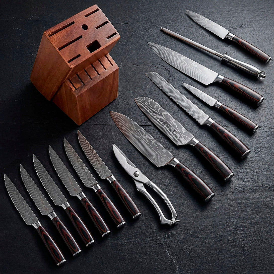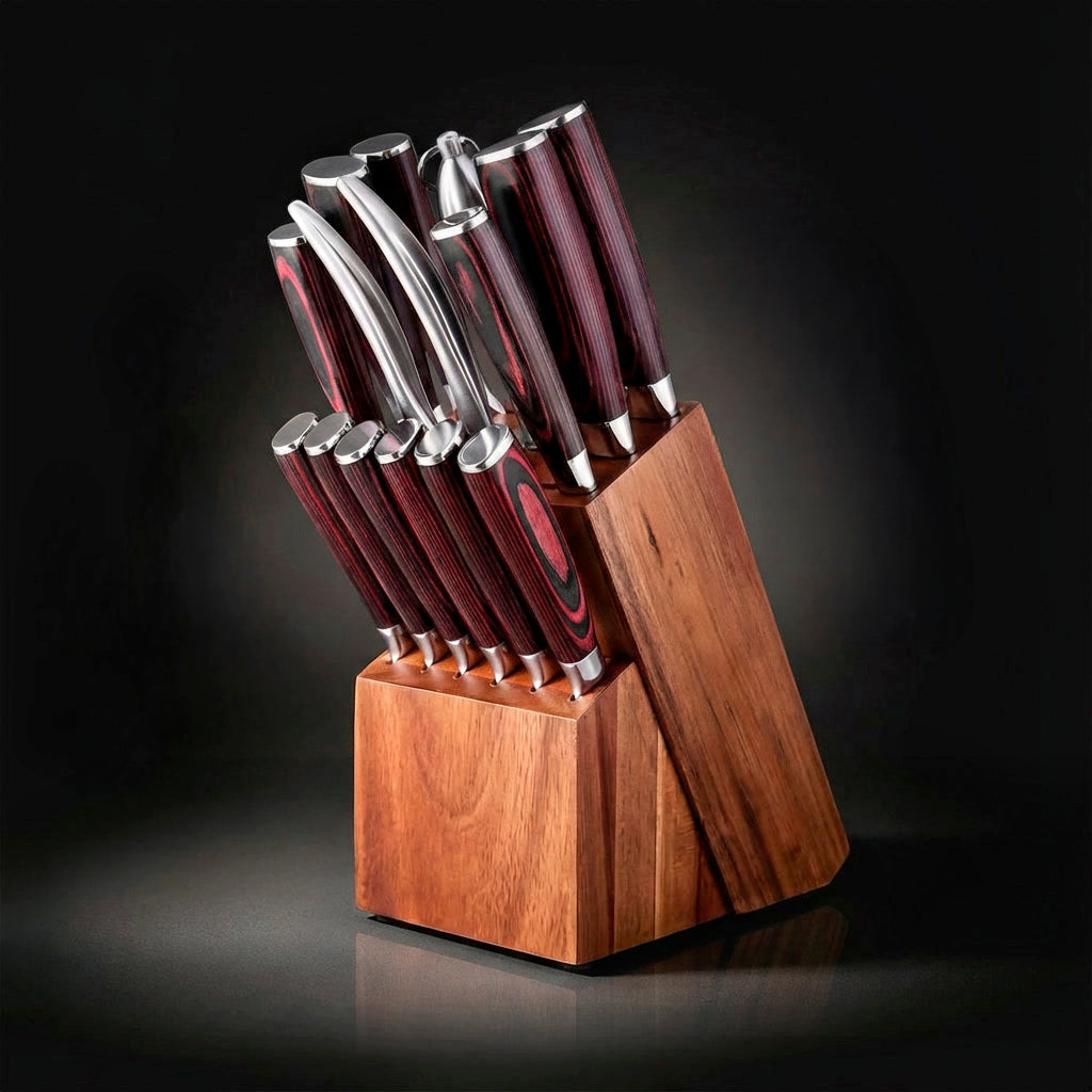 Safe, organized storage for your full set. The solid wood knife block protects blade edges, keeps your tools within easy reach, and maintains a clean, professional look on your countertop.