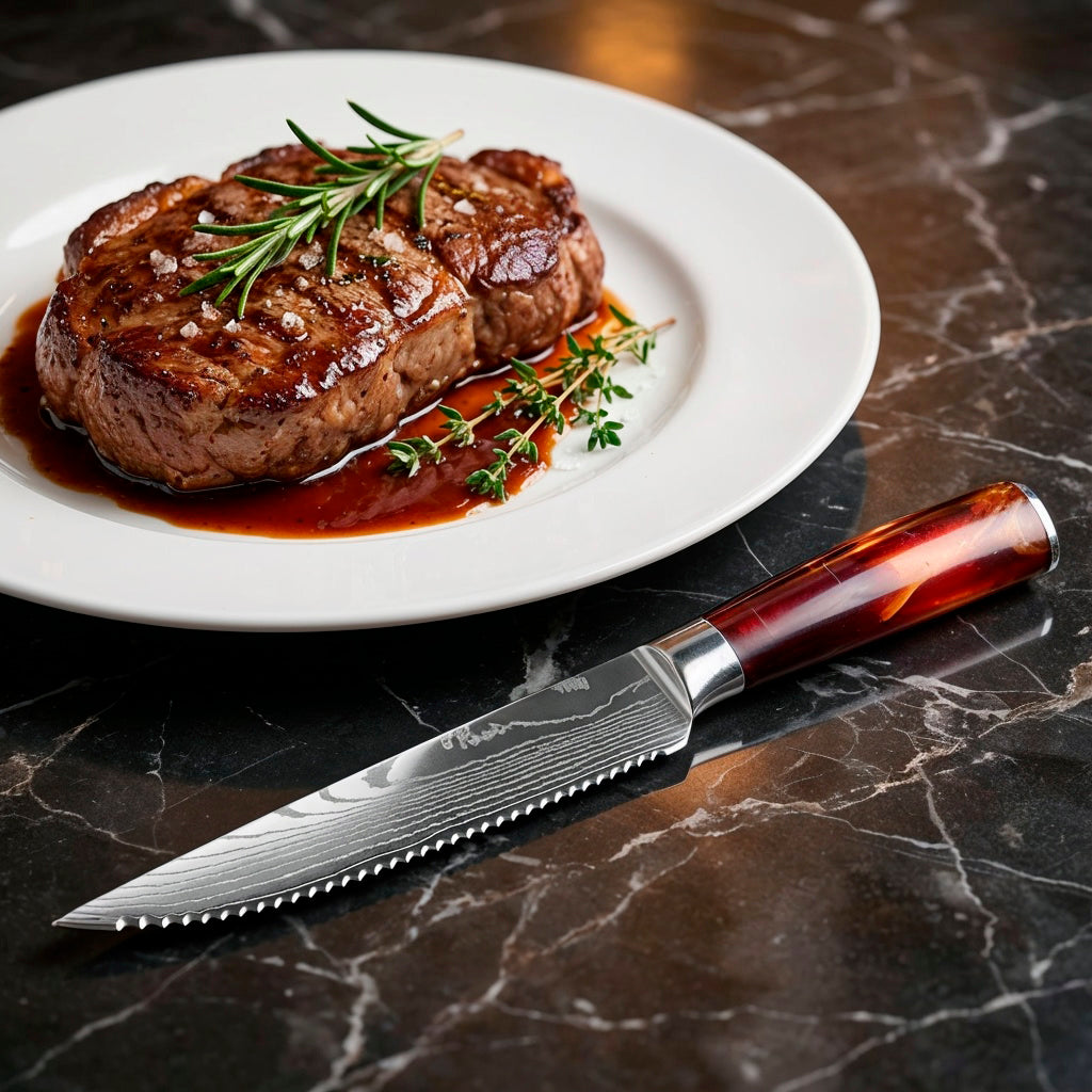 This 6-piece steak knife set is designed to slice cleanly through cooked meats, preserving texture and juices with every cut. Each knife features a straight, razor-sharp edge that glides smoothly — no sawing, no crushing.