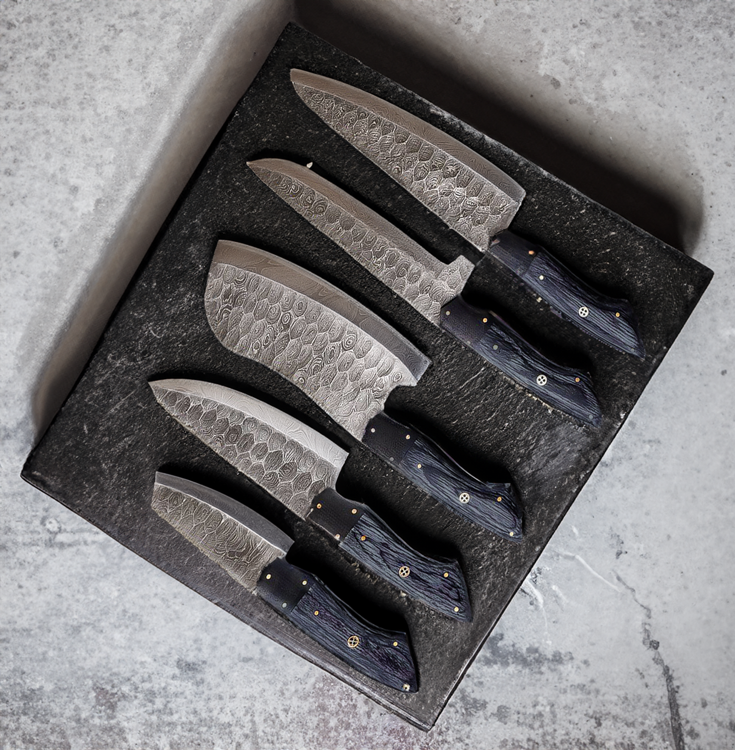Forged from premium Damascus steel, each blade showcases the intricate patterns and unmatched sharpness that only the best materials can provide.