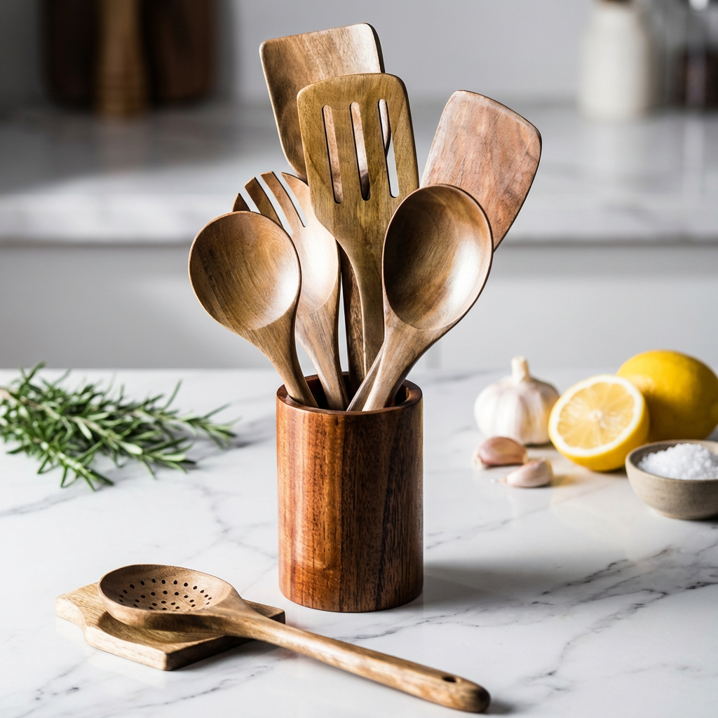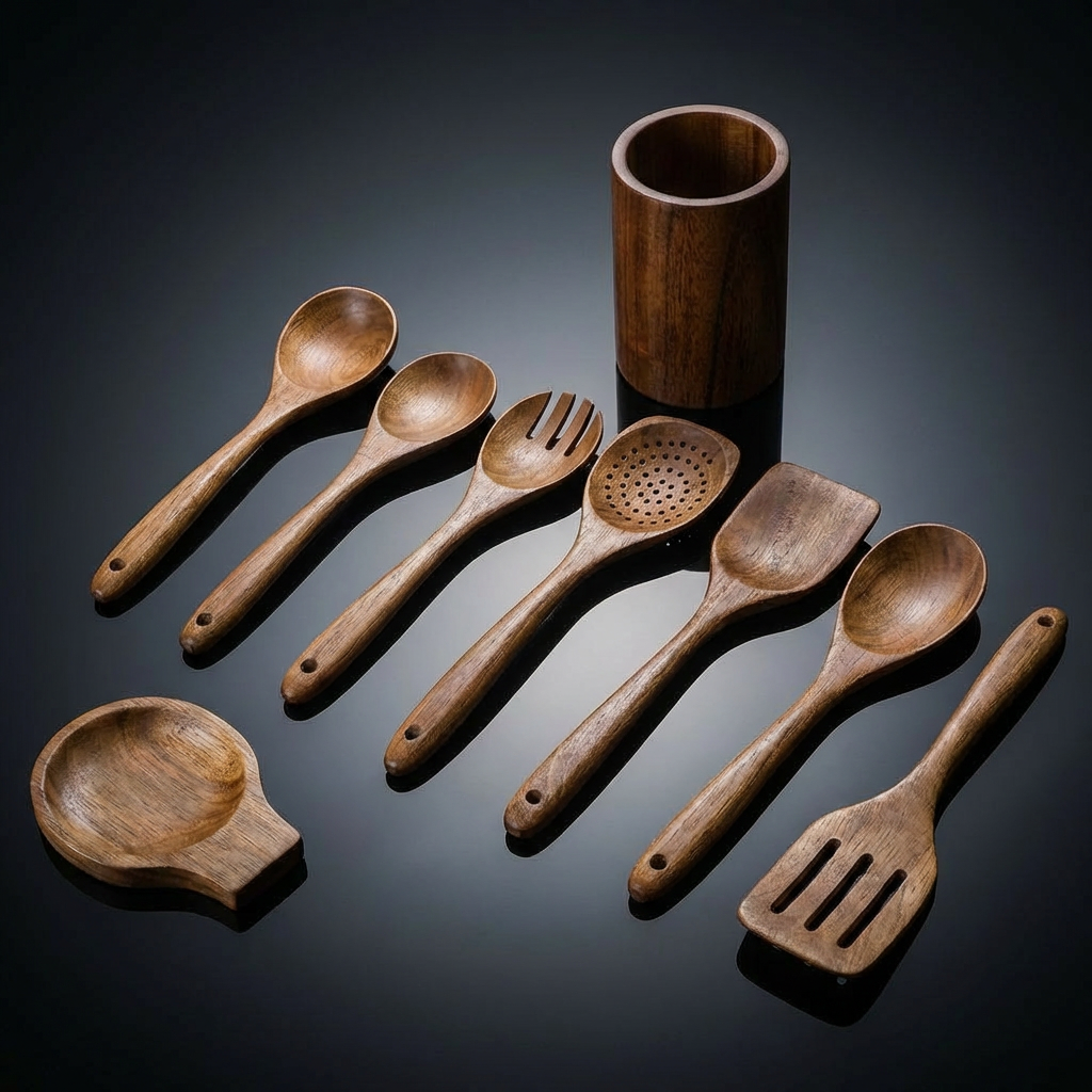 Silicone melts. Metal scratches. Cheap wood splinters. Teak does none of that. It handles high heat without warping, moves through food without resistance, and gets better looking the more you use it. These are the tools that belong next to the stove — not in a drawer."